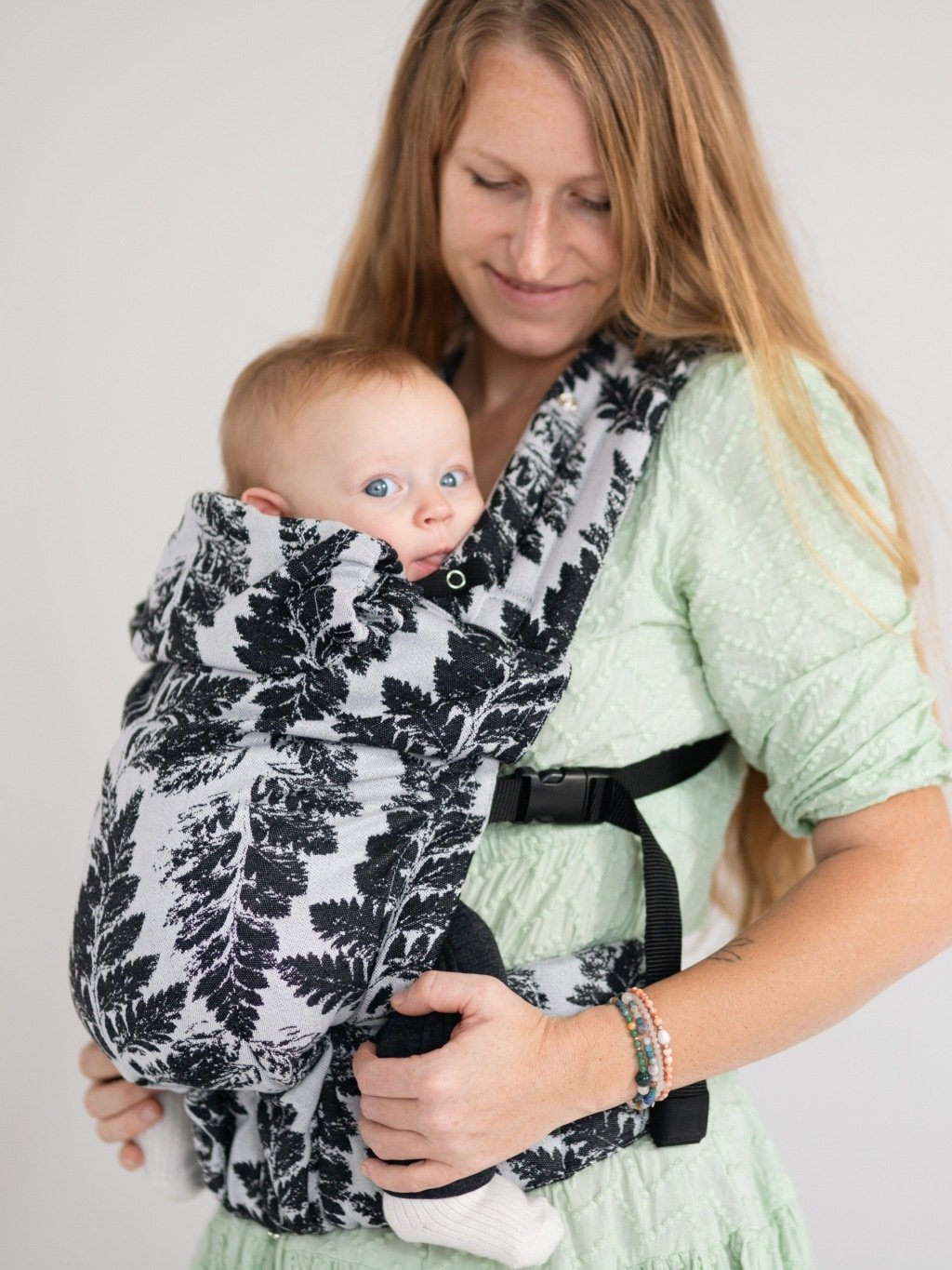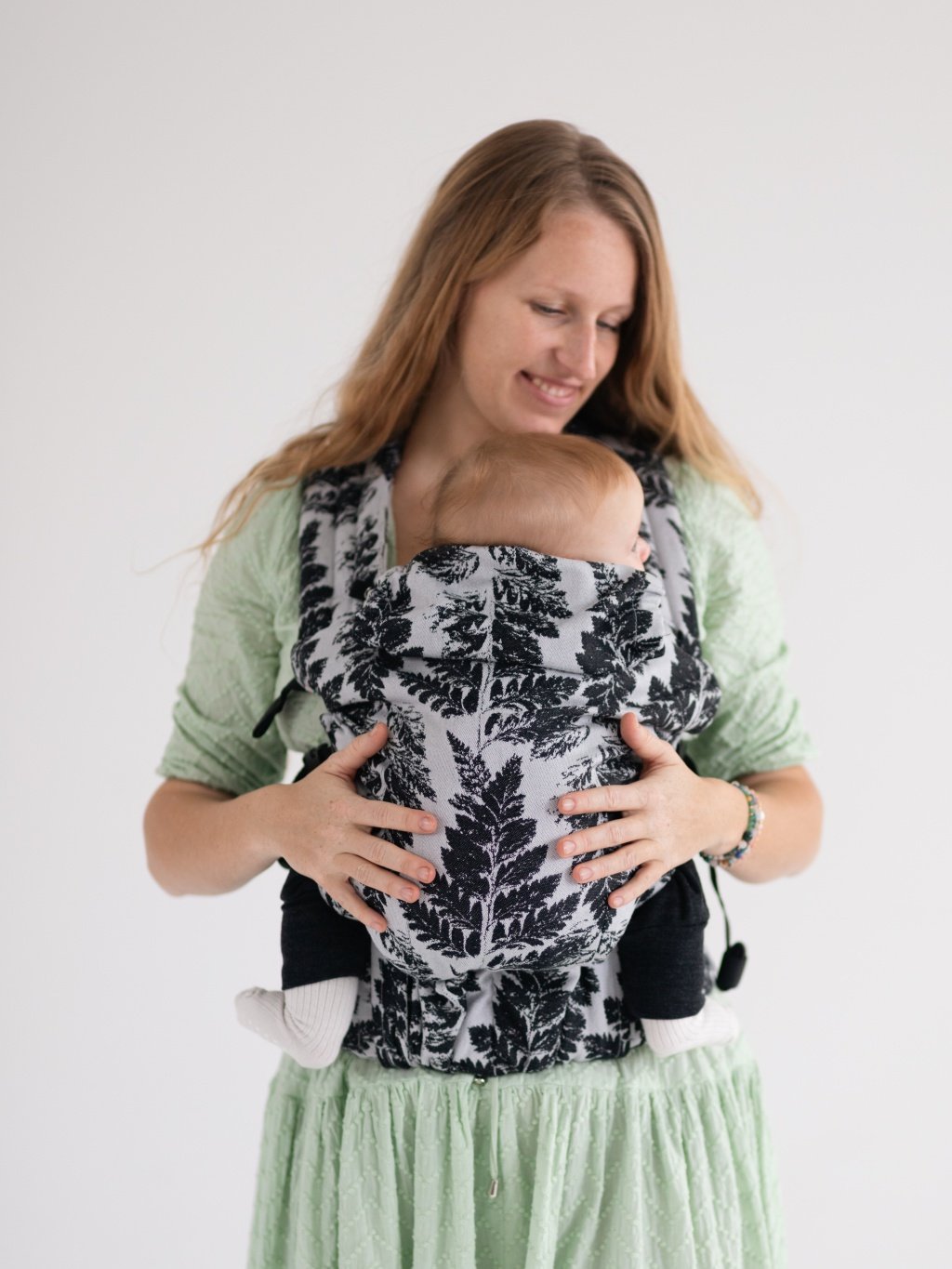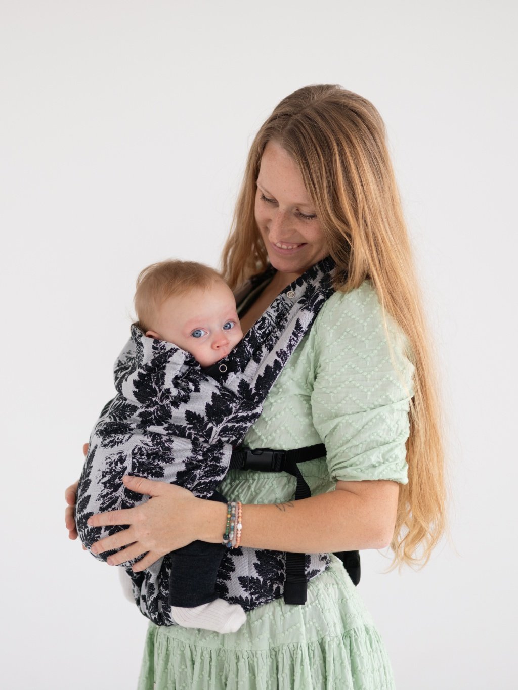 The carrier is made from premium 100% cotton woven wrap fabric (jacquard weave), produced in the Czech Republic.